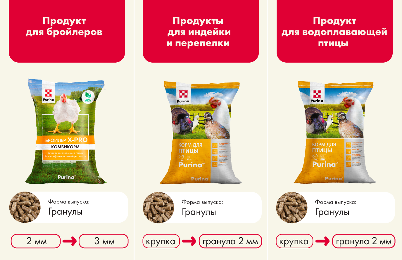 Продукты для индейки и перепелки 4123 и 4153, ранее доступные в форме крупки, ныне отпускаются в форме гранулы 2 мм.