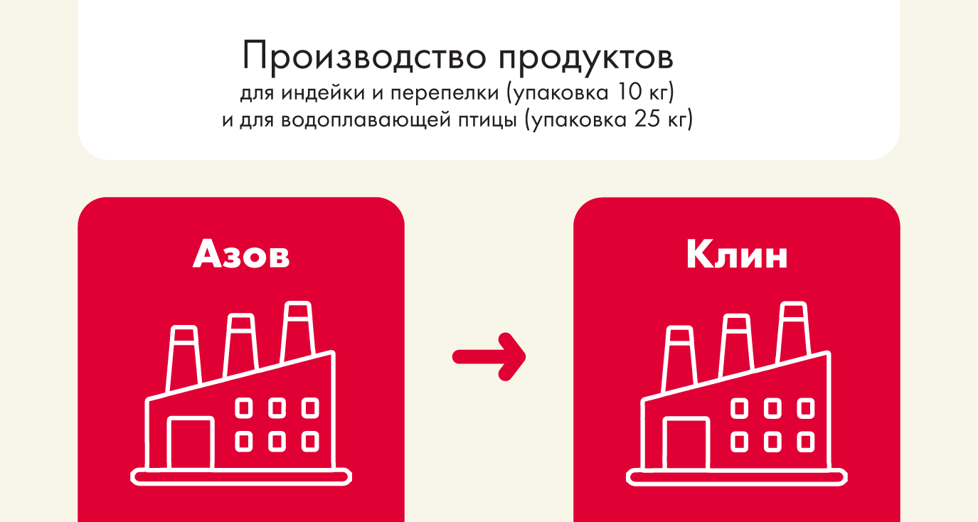 Продукты 4123 для индейки и перепелки (упаковка 10 кг) и 4351 для водоплавающей птицы (упаковка 25 кг), ранее производившиеся в Азове, теперь производятся в Клину.