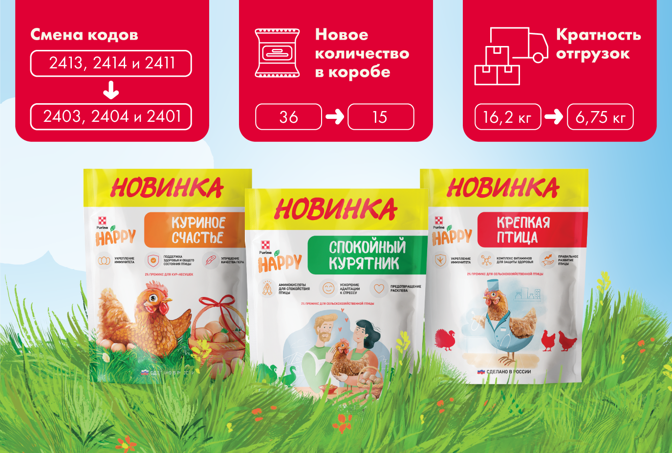 Подкормки «Куриное счастье», «Спокойный курятник» и «Крепкая птица», ранее выходившие соответственно под кодами 2413, 2414 и 2411, теперь доступны под кодами 2403, 2404 и 2401 соответственно.
